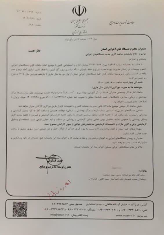احتراما با عنایت به بخشنامه شماره ۸۵۴۹۹ مورخه ۱۴۰۴/۹/۲۲ سازمان اداری و استخدامی کشور، به اطلاع کلیه همکاران محترم می رساند؛ فعالیت واحدهای تابعه دانشگاه علوم پزشکی و خدمات بهداشتی، درمانی استان لرستان (به استثنای پایگاه‌های فوریت پزشکی، مراکز بهداشتی ۲۴ ساعته، واحدها و بخش‌های مشمول نوبت کاری در بیمارستان ها به دلیل ضرورت ارائه خدمات بهداشتی و درمانی) ساعات کاری سایر همکاران از روز دوشنبه اول دیماه ۱۴۰۴ لغایت ۱۵ فروردین ماه ۱۴۰۵ به شرح ذیل می باشد؛  شنبه الی چهارشنبه: از ساعت ۸ صبح لغایت ۱۴ عصر می باشد.  و پنجشنبه ها: به صورت دورکاری تا پایان سال جاری اعلام می شود.